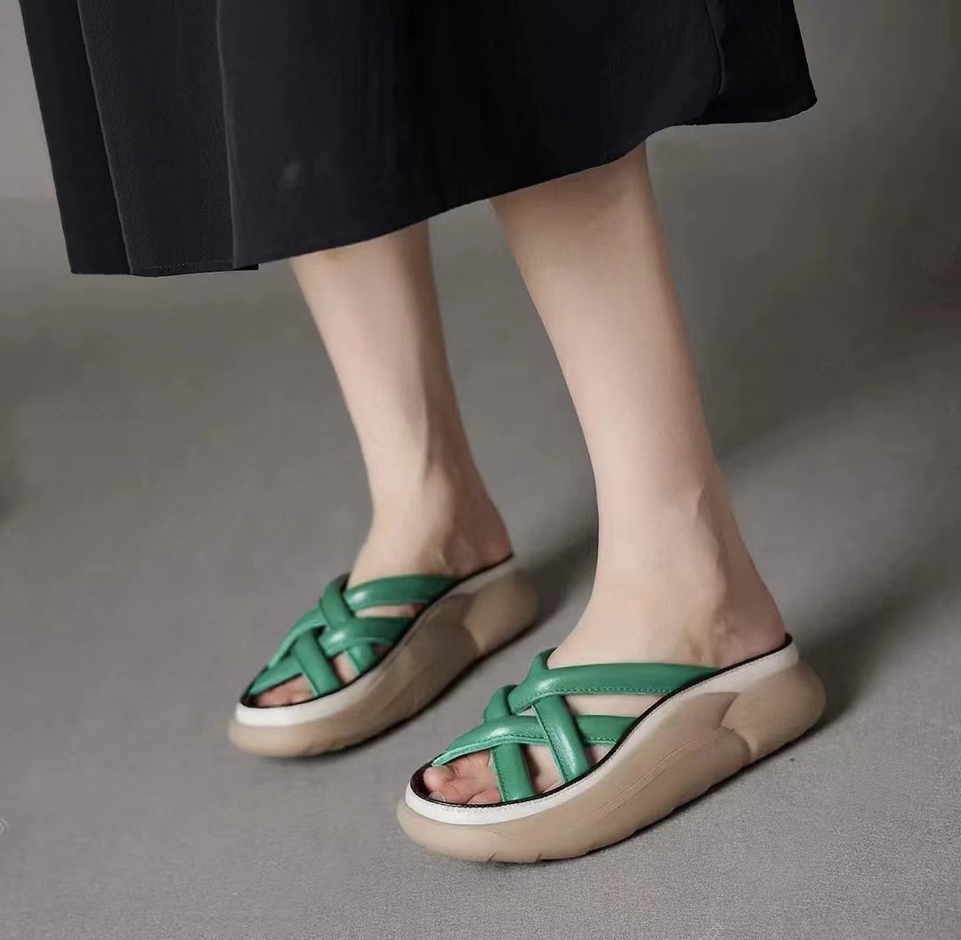 レディース厚底本革スリッパ